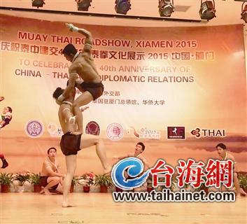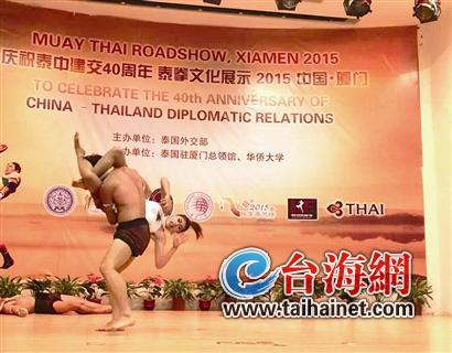 谦逊地合掌之后,对准对手连番击打,钩、缠、踢行云流水……当原汁原味的泰拳真实地出现在眼前时,大学生们大呼“涨姿势”!昨晚,为庆祝泰中建交40周年,由泰国外交部、泰国国家基金会、泰国驻厦门总领事馆、华侨大学联合举办的“2015泰拳艺术展示”在厦门大学火爆开场。来自泰国“兰纳(Lanna Fighting)”泰拳馆的14名男女拳手现场展示了拜师舞、古代泰拳的刀剑格斗、泰拳搏击等泰拳文化,让学生们领略到了泰国文化的魅力。