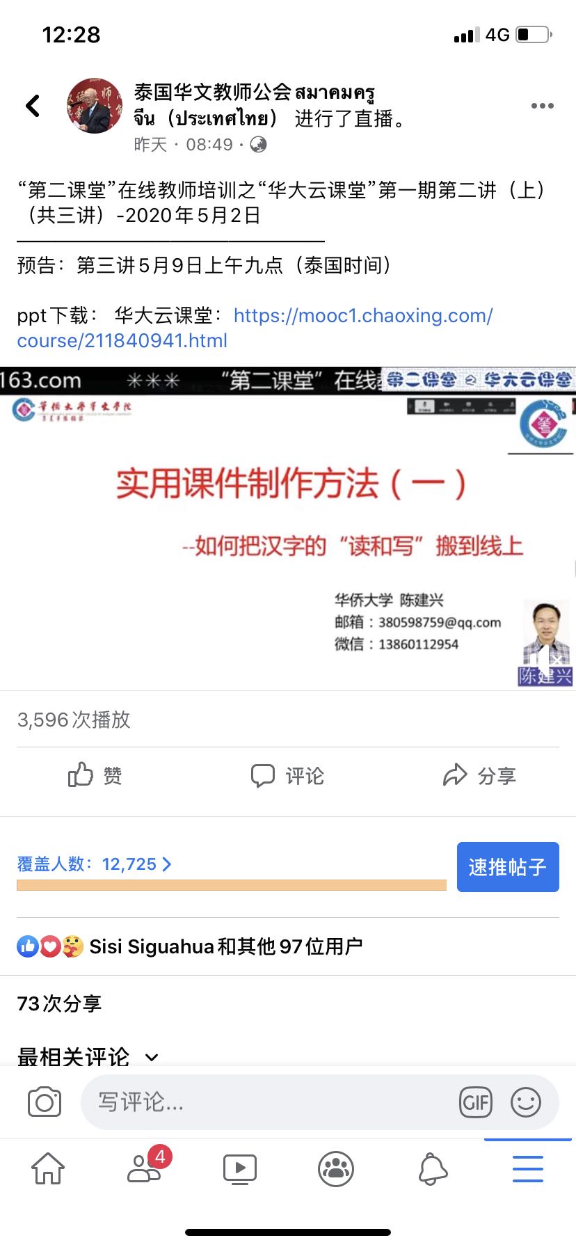 这是由华侨大学和泰国华文教师公会联合主办的“华大云课堂”第一期泰国华文教师培训班的第二次培训,采用“钉钉会议+Facebook直播”的方式进行,当天已有近6000位老师收看课程,超过2万人关注培训活动,全球观看人数还在上升。
